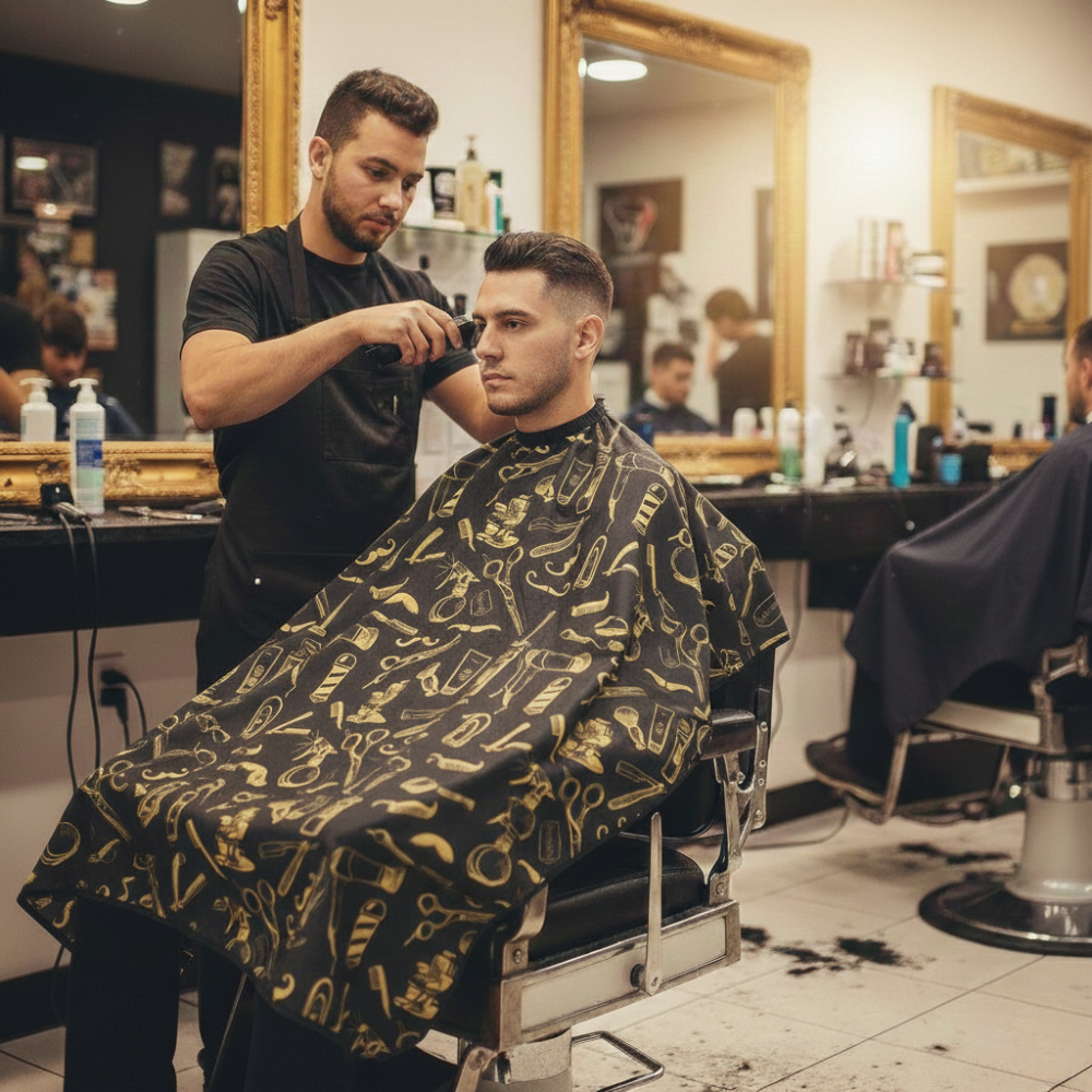 Patrón clásico que incluye herramientas de barbería vintage, tónicos y peines.