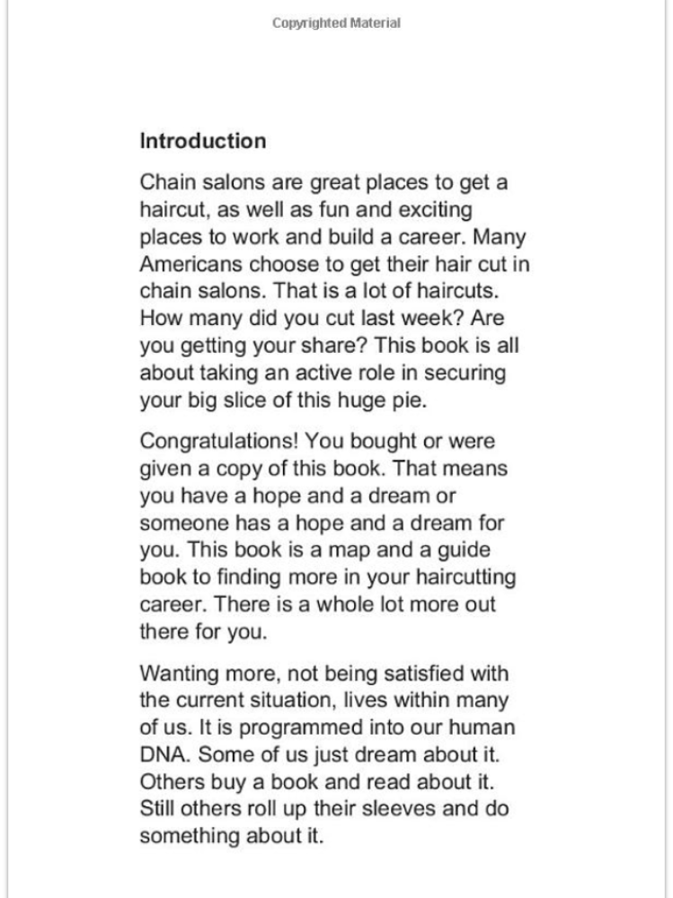 When measured against the total population, the idea of 100 more clients is barely a blip on the radar screen of the industry. That said, most of our lives and businesses would be significantly altered if we were able to capture just 100 more haircut clients than we currently have. One hundred new clients will not happen with one new client every day. Achieving a growth number like that will take some time, and it will take hard work. Growth of this type will build like a snowball rolling downhill. Building a clientele is a journey, not a single event or action. There are steps to take and processes to follow. This book is intended to be your guide book for this adventure. This special Chain Salon Edition focuses on the unique challenges and opportunities of cutting hair in a chain salon environment.