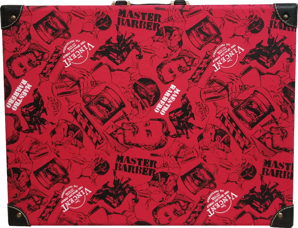The Nostalgic Mastercase Collection includes a removable bamboo compartment and features our patent elevating and tilting clipper tray that is lined with fabric to provide extra protection for clippers. Our Mastercase is ideal for professionals who work on location and need to keep their tool protected. Vintage barber pattern. Red tilting tray lining.